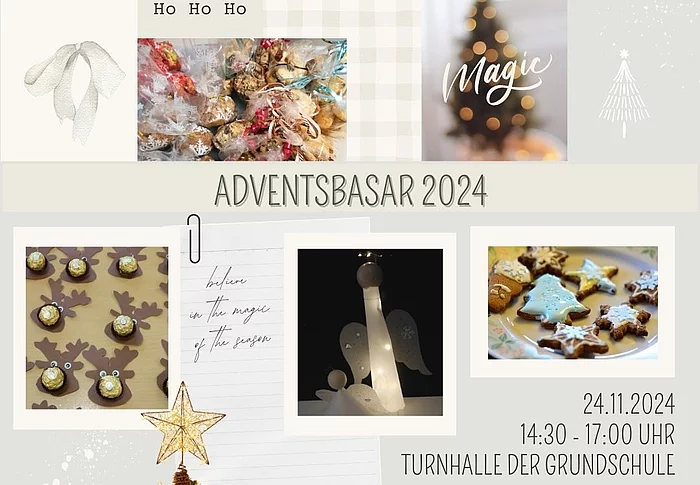 Der Adventsbasar findet am Sonntag, den 24.11.2024 von 14:30 – bis 17:00 Uhr in der Turnhalle und auf dem Platz davor statt. Verkauft werden die prachtvollen Dinge, die Ihre Kinder am 13.11.2024 gebastelt haben. Eröffnung und gemütliches Zusammensein findet in der großen Turnhalle statt. Pro Schule wird für Kaffee, Kuchen, von Schülereltern gebackene Plätzchen und Punsch sorgen. Der Elternbeirat kümmert sich ebenfalls um das leibliche Wohl. Die musikalische Umrahmung übernehmen die Bläserklasse…